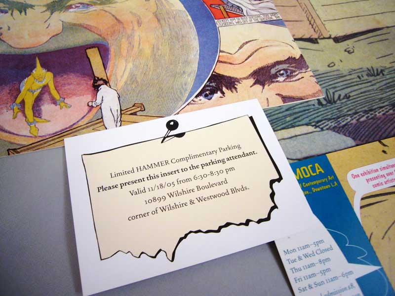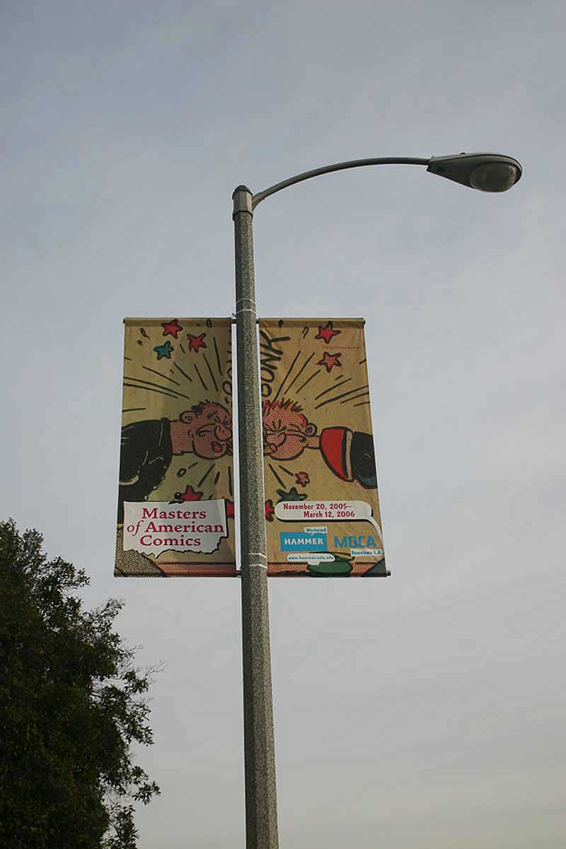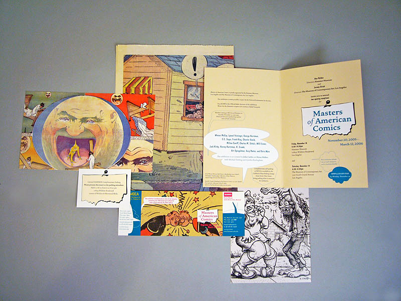 Comprehensive identity for the exhibition, Master of American Comics. We started with the design of the exhibition catalog, then extended the identity into all promotional material, including street banners, posters, and various printed collateral.